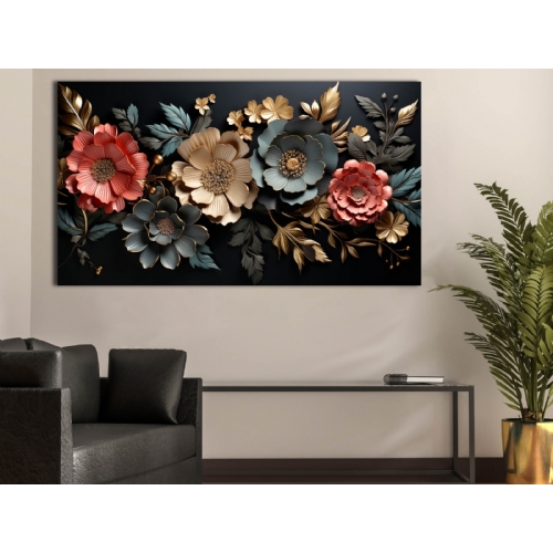 Sim İşlemeli Siyah Fonda Çeşitli Renklerde 3D Çiçekler Kanvas Tablo